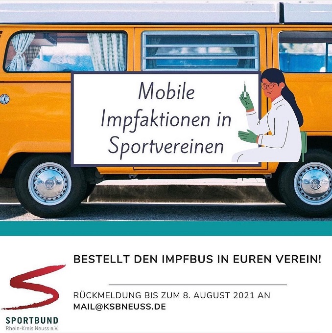 Der Sportbund Rhein-Kreis Neuss e.V. führt mit seinem Impfbus mobile Impfaktionen in Sportvereinen durch. Falls ihr noch Unterstützung beim Impfen braucht und Interesse an diesem super Angebot habt, meldet euch gerne unter Diese E-Mail-Adresse ist vor Spambots geschützt! Zur Anzeige muss JavaScript eingeschaltet sein!.