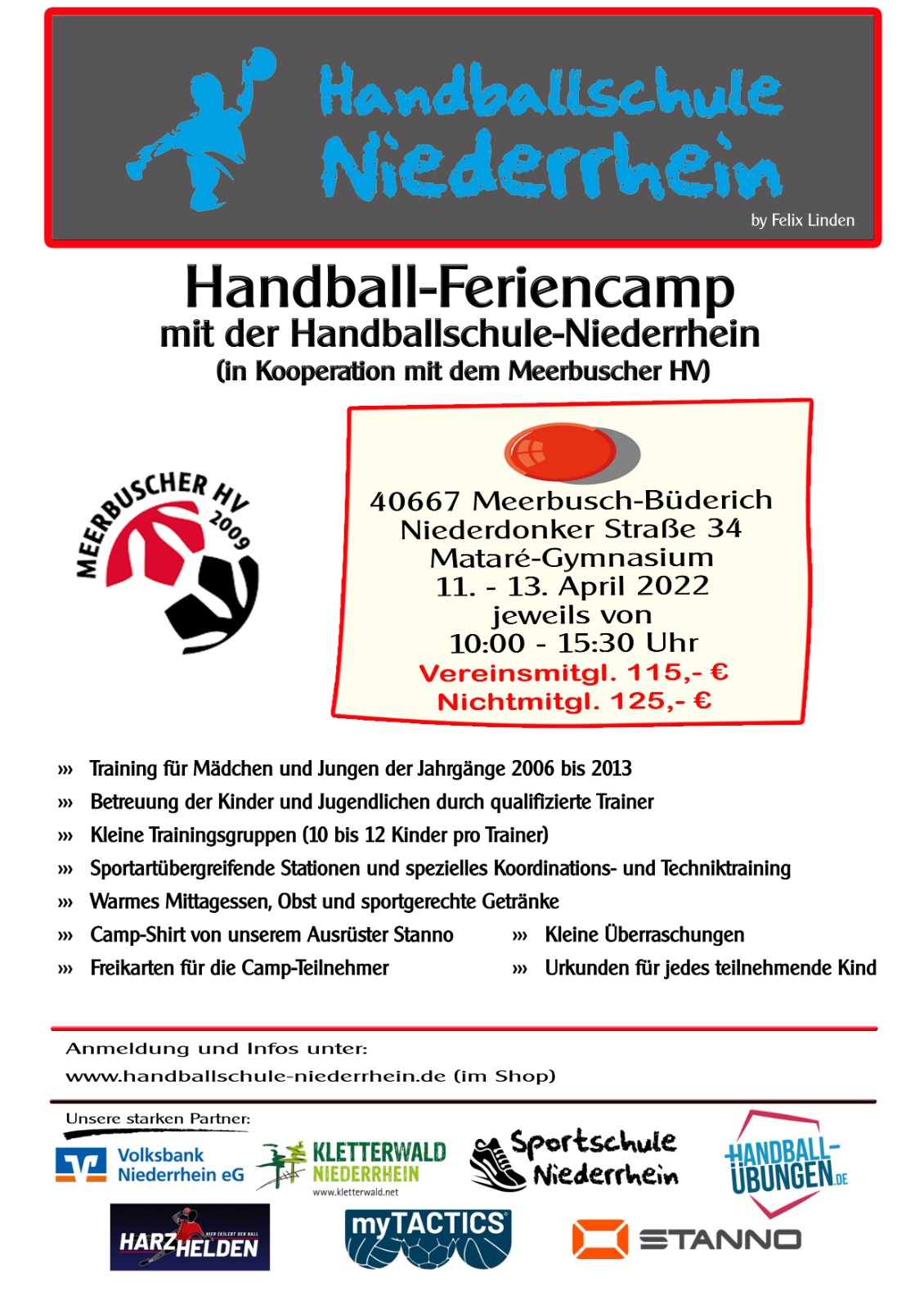 Vom 11.-13. April findet das Handball-Feriencamp mit der Handballschule-Niederrhein bei uns im Mataré-Gymnasium statt. Trainiert wird jeweils von 10-15:30 Uhr. ??♂️??