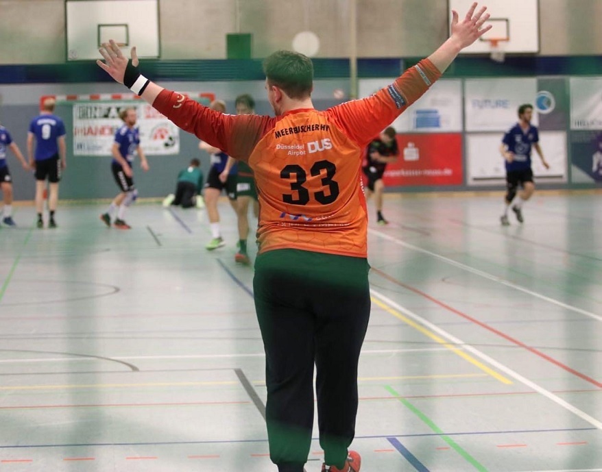 Genau eine Woche später traf man sich dann in Unterrath zum Rückspiel. Dabei reisten die Meerbuscher mit dem wahrlich letzten Aufgebot an. Corona, Verletzungen und normale Erkrankungen hatten den Kader stark ausgedünnt und auch Toptorjäger Rob Hollburg musste kurzfristig passen. Dennoch schwor Trainer Markus Wölke seine Jungs darauf ein, den Kampf gerade in der engen personellen Situation anzunehmen und das gute Gefühl vom Sieg der Vorwoche mit in die Partie zu nehmen und die Jungs hatten in der Kabine gut zugehört. Gestützt auf einen überragenden Felix Brendel im Tor lag die Mannschaft von Minute eins an in Führung und setzte sich in der Startphase mit 10:6 in Front. Dann der nächste Schock für das personell gebeutelte Team. Mit Sebastian Huser schied der nächste Rückraumspieler verletzt aus und konnte nicht mehr eingesetzt werden. Damit war erneut Kreativität in der Aufstellung gefragt und die Gastgeber aus Unterrath nutzten diese Phase um sich bis zur Pause auf 10:12 heranzukommen. Glücklicherweise stieß zur 2. Halbzeit mit Markus Pitsch eine weitere Option für den Rückraum zum Team, doch postwendend verlor man Felix Kubicki, der nach einem Zusammenstoß mit seinem Gegenspieler auch nicht mehr weiterspielen konnte. Bis zum 20:20 verlief die Partie ausgeglichen und acht Minuten vor dem Ende sah es so aus, als ob die Kräfte der letzten Mohikaner im Meerbuscher Trikot nicht mehr reichen sollten. Doch da war noch die Wand im Tor der Meerbuscher. Gestützt auf die Paraden von Felix Brendel richtete sich die Mannschaft in der Schlussphase noch einmal auf und schaffte einen 4:0-Lauf und gewann das Rückspiel auch verdient mit 24:20.