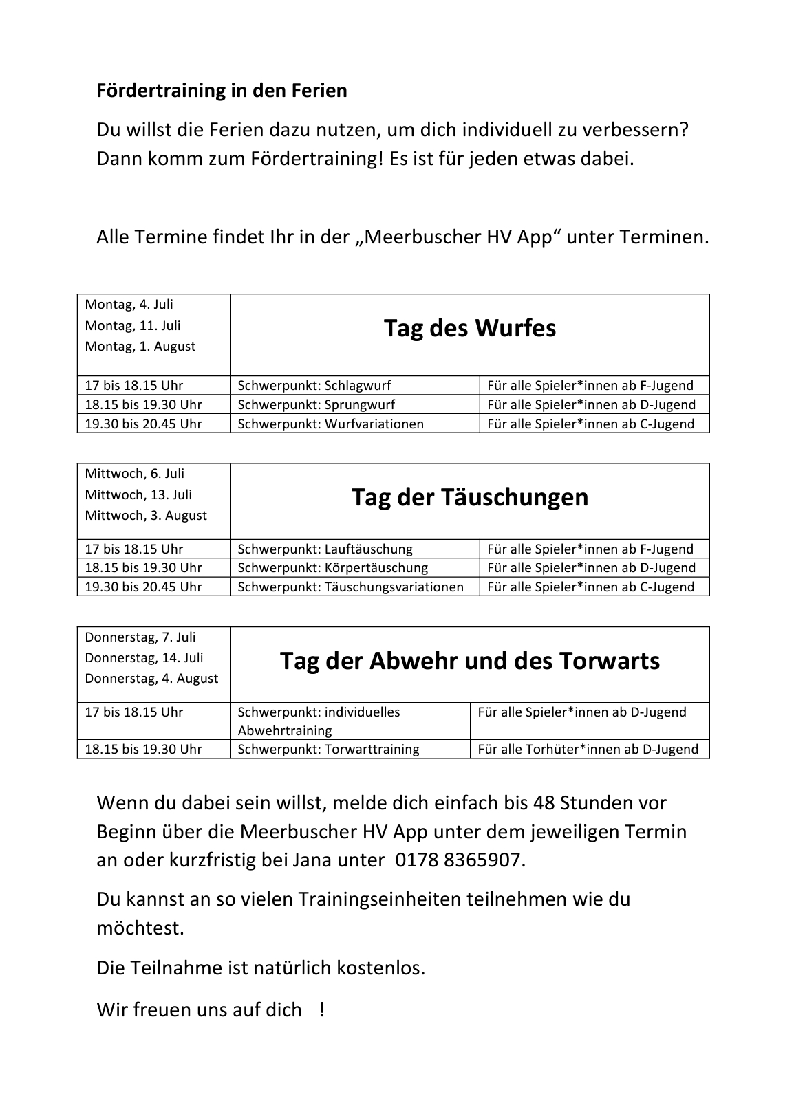 Wenn du dabei sein willst, melde dich einfach bis 48 Stunden vor Beginn über die Meerbuscher HV App unter dem jeweiligen Termin an oder kurzfristig bei Jana unter 0178 8365907.