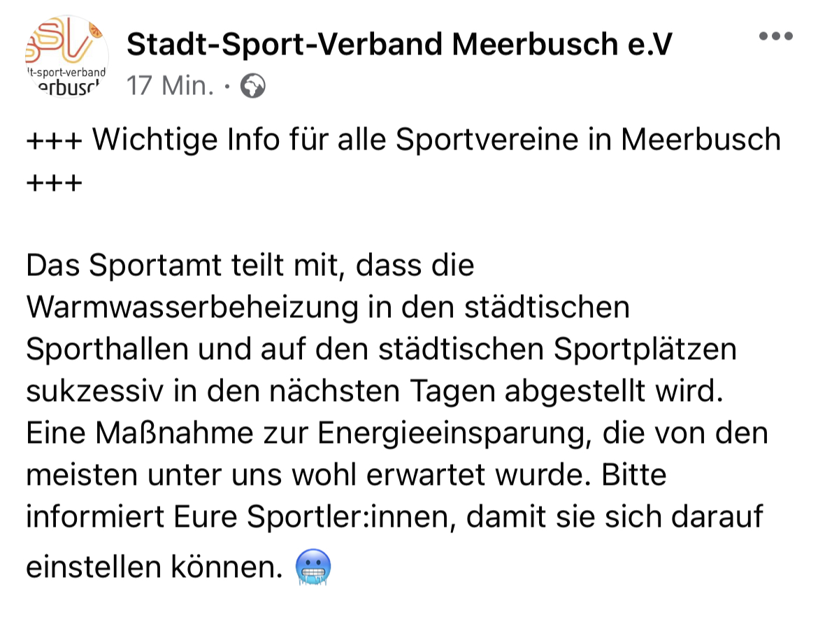 +++ Wichtige Info: Warmwasserbeheizung in den Sporthallen +++ Als Energiesparmaßnahme wird die Warmwasserbeheizung in den Sporthallen in den nächsten Tagen abgestellt. ?⚪️⚫️