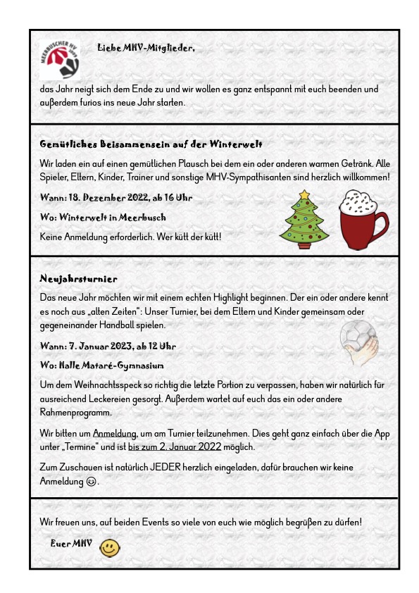 Liebe MHV-Mitglieder, das Jahr neigt sich dem Ende zu und wir wollen es ganz entspannt mit euch beenden und außerdem furios ins neue Jahr starten